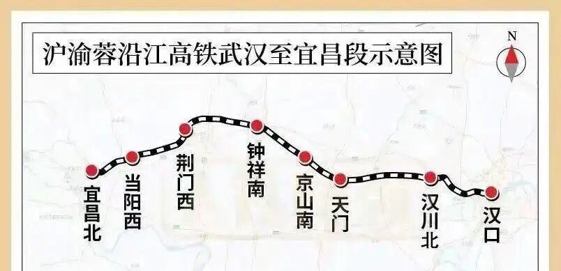 线路起自武汉市,经天门市、荆门市,终至宜昌市。正线全长约313公里,新建桥梁88座,隧道25座,桥隧比84.8%。新建汉川北、天门、京山南、钟祥南、荆门西、当阳西、宜昌北等7座车站,其中荆门西站部分工程为配合荆荆高铁开通已于2024年底投用。