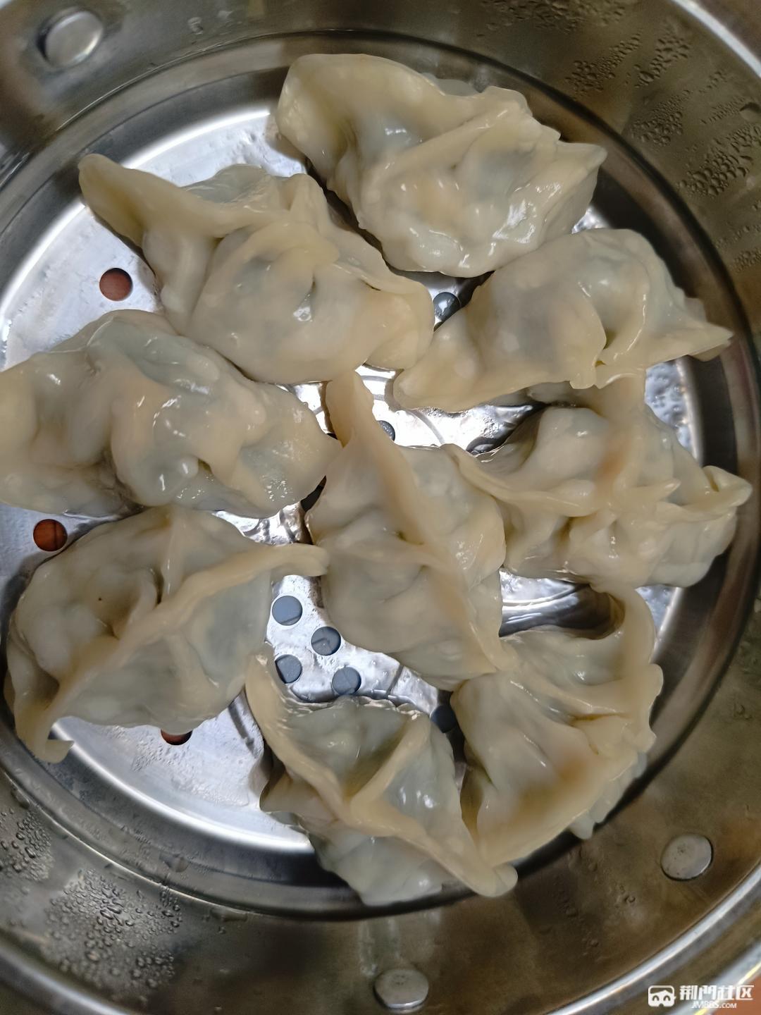 昨晚加班包的饺子,今早蒸着吃的。以前都是包的肉馅的,这次尝试鸡蛋素馅的,蒸着吃也美味。