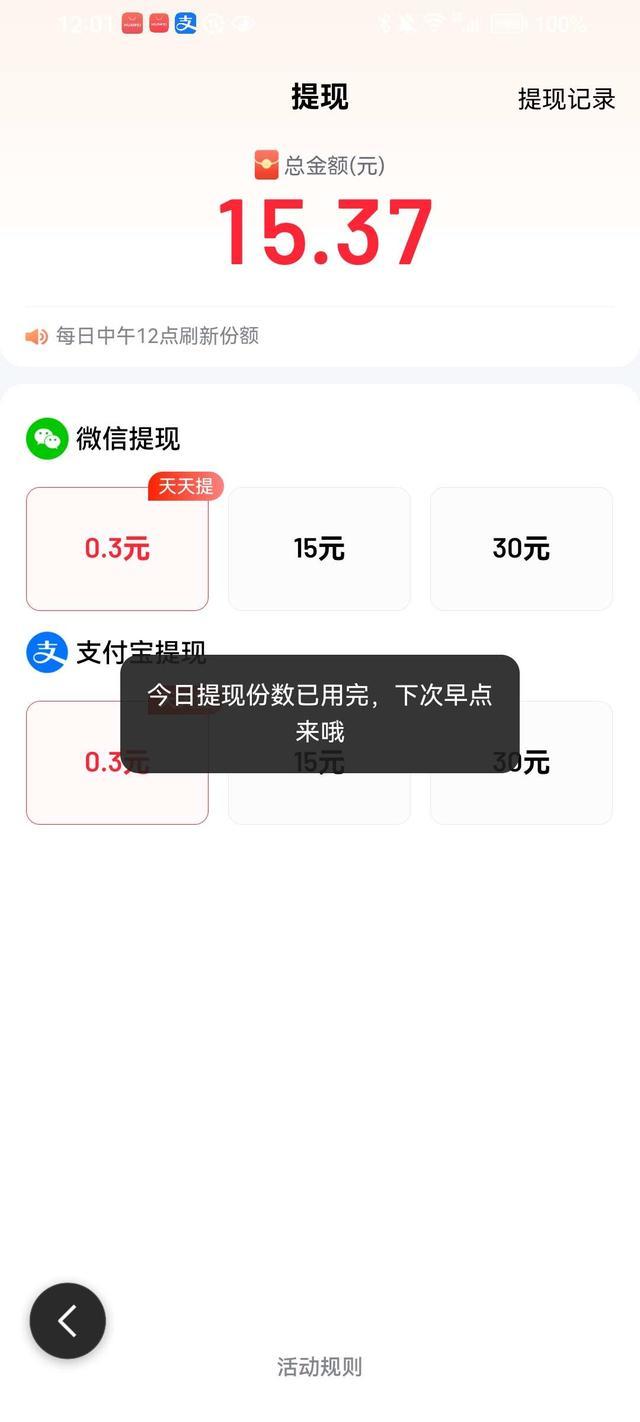 在百度极速版辛辛苦苦赚了15块钱,提不了现,说每天12点可以提现,可是11点59秒就开始提,就是提不了。