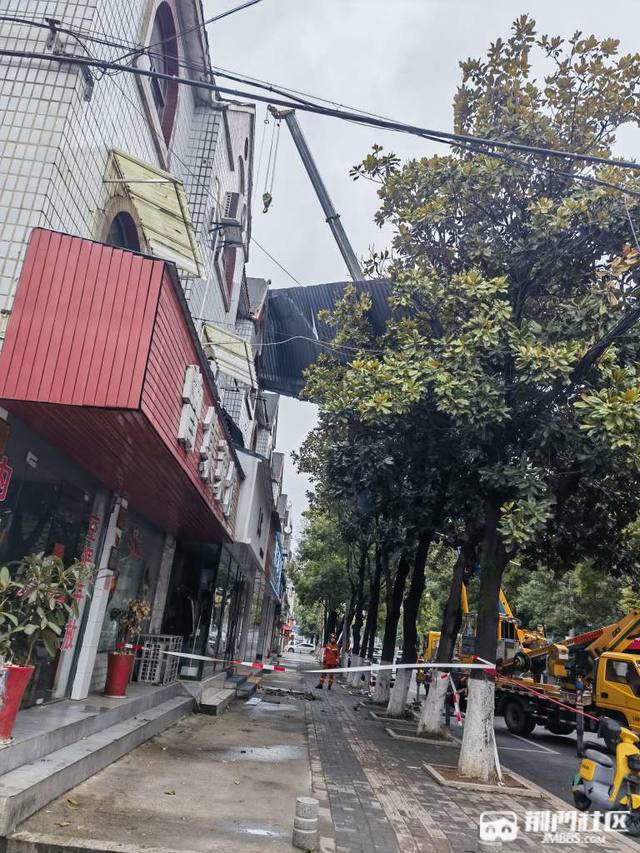 试问荆门昨天的风有多大,路上的树吹倒了,一居民楼楼顶铁皮直接掀翻。