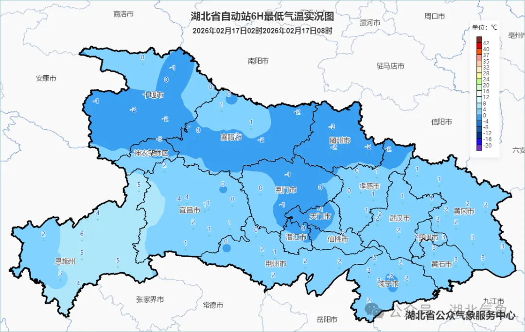 今晨最低气温大部-3~3℃,有24个县市在0℃线及以下,主要集中在鄂西北和江汉平原北部。