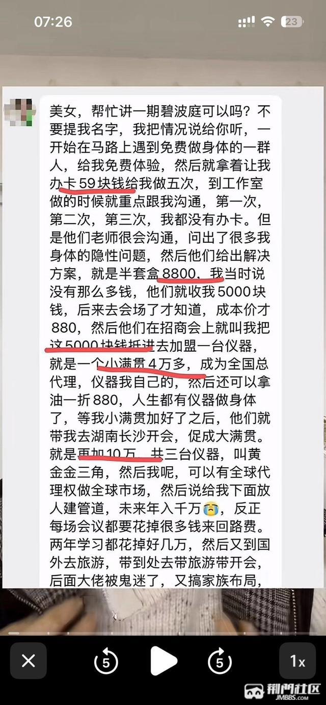 出来找工作的宝子们注意啦!山水龙城旁边一家叫,,(yuan y美业)千万不要进去,哪里面全是骗子,割韭菜的,刚进去说是招手工人,说的是底薪➕提成,进去了就让你体验一下仪器的效果,你身体上的什么问题她们都摸清了就开始捣鼓你卖精油,然后要去听课,听课后现场就开始6.7.8个人围着你转说要你卖仪器自己做老板,收益高、还能把自己和家人身体问题都能调理好,就各种捣鼓你,一台仪器4万多.全都是割韭菜的,旧人带新人去割,这样的情节一直不断循环着,找工作的一定要注意,仪器叫(碧什么庭)看下图,就是这个逻辑
