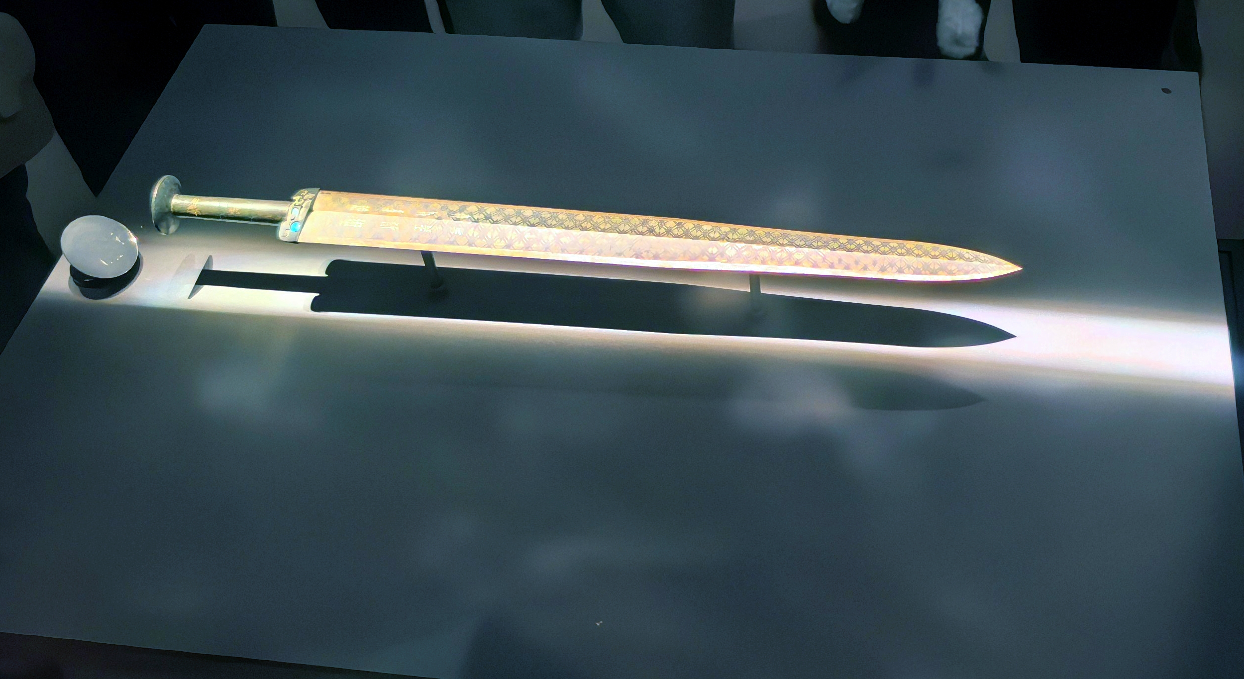 越王勾践剑的展厅不算大,却围着不少人,大家都下意识地放轻了脚步,生怕惊扰了这柄沉睡了2500多年的剑。玻璃展柜里,它不算特别起眼,没有华丽的装饰,通体泛着温润的青铜光泽,可当目光落在剑身上,那种穿越千年的锋芒依旧扑面而来。讲解员轻声介绍,这把剑长55.7厘米,重875克,1965年从湖北江陵望山1号墓出土,历经千年却毫无锈蚀,刃薄锋利,据说当年出土时,还能轻松划开20张白纸。