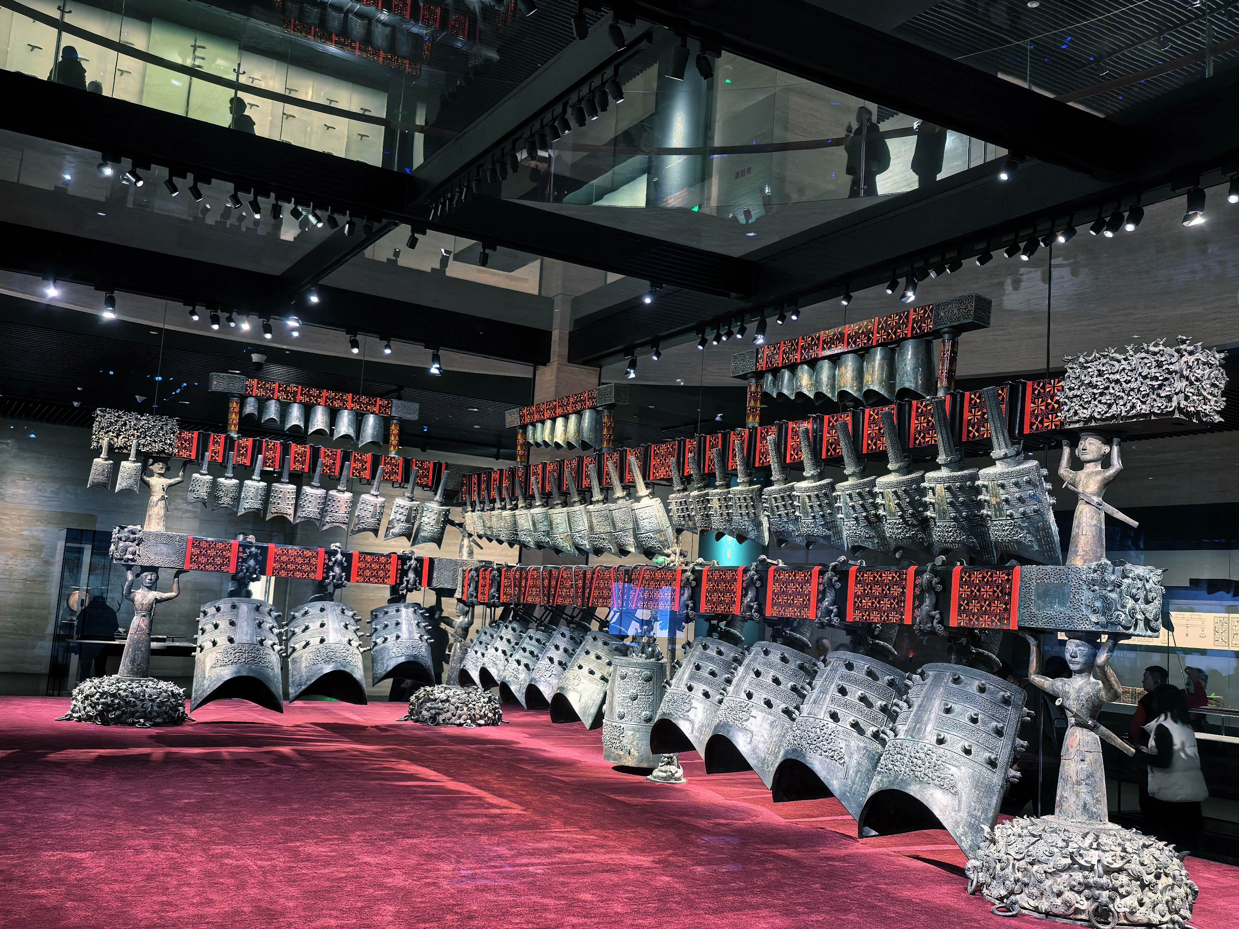 离开越王勾践剑的展厅,顺着走廊往下,就到了曾侯乙的“地盘”——曾侯乙展厅。如果说勾践的传奇是隐忍与逆袭,那曾侯乙的故事,就是礼乐与匠心的极致体现。展厅很大,空高两层,仿佛为这位战国时期的曾国国君,打造了一座“超级豪宅”,最显眼的,就是正中央那套气势恢宏的曾侯乙编钟。