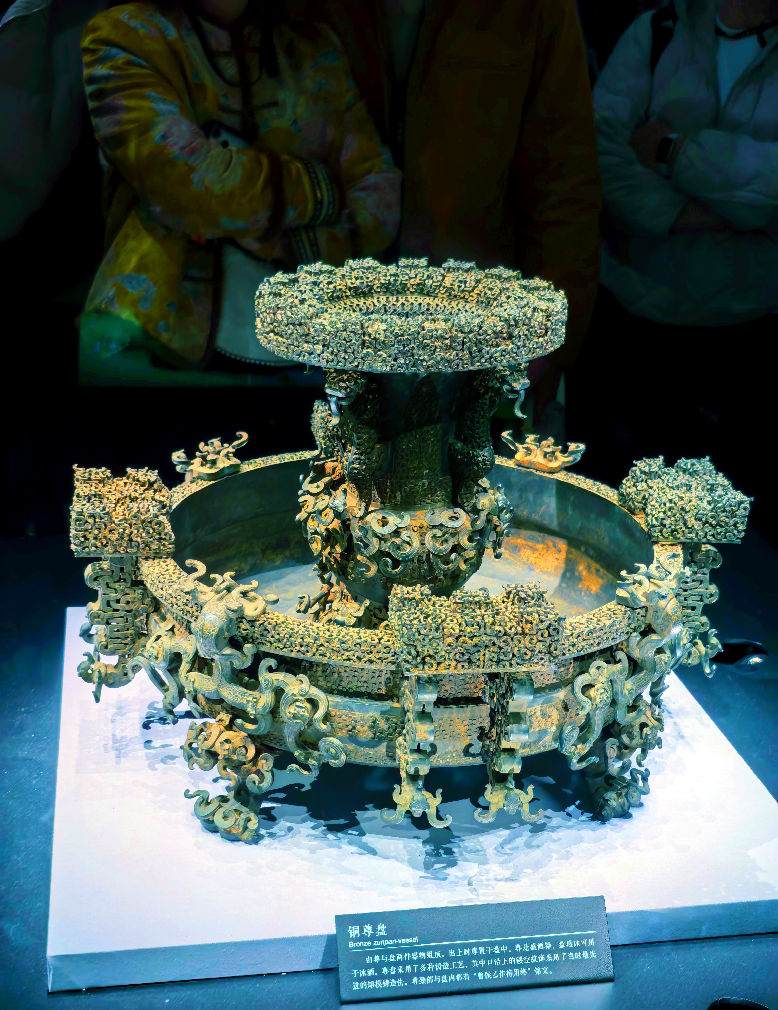 展厅里还有很多曾侯乙墓出土的文物,有被誉为“青铜铸造巅峰”的曾侯乙尊盘,尊与盘上布满了玲珑剔透的镂空纹饰,用复杂的失蜡法铸造而成,34个部件经56处铸焊连成一体,每一处细节都彰显着古人的匠心;还有能起到冰镇作用的铜鉴缶,内缶贮酒,外鉴置冰,堪称“古代冰箱”,让人不得不佩服古人的智慧。看着这些文物,我仿佛看到了两千多年前,曾侯乙在宫廷中举办盛宴,编钟齐鸣,尊盘盛酒,礼乐盛行的繁华景象。这位不见于史册的曾国国君,用一座墓葬、一万五千余件文物,为我们还原了一个高度发达的礼乐文明,也让我们看到了战国时期青铜工艺的巅峰成就。