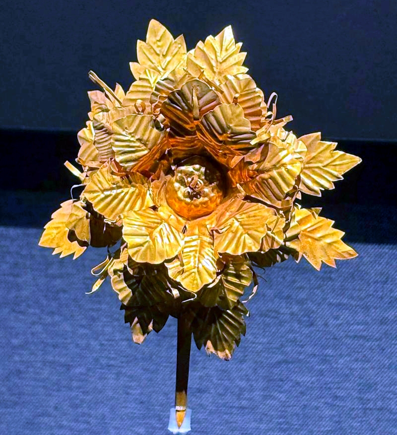 展厅里摆满了金器、玉器、宝石,每一件都珠光宝气,让人目不暇接。有重达100多克的金锭,有镶嵌着各色宝石的金簪,还有来自西洋的宝石腰带,这些文物不仅展现了梁庄王的贵族生活,更见证了郑和下西洋的壮举,是海上丝绸之路中西文化交流的缩影。我印象最深的,是一枚镶嵌着红宝石的金戒指,宝石色泽艳丽,工艺精湛,讲解员说,这枚戒指上的宝石,就来自西洋,是当时中西贸易的见证。