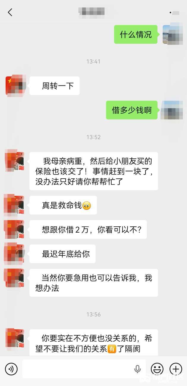一个四川的战友,给我发消息了,一个新兵班的战友,都退伍十几年了现在没怎么联系,今天给我发消息说家里遇到事了,要借两万块钱,说多不多说少也不少,我也是个普通打工仔一个啊,到底该不该借啊